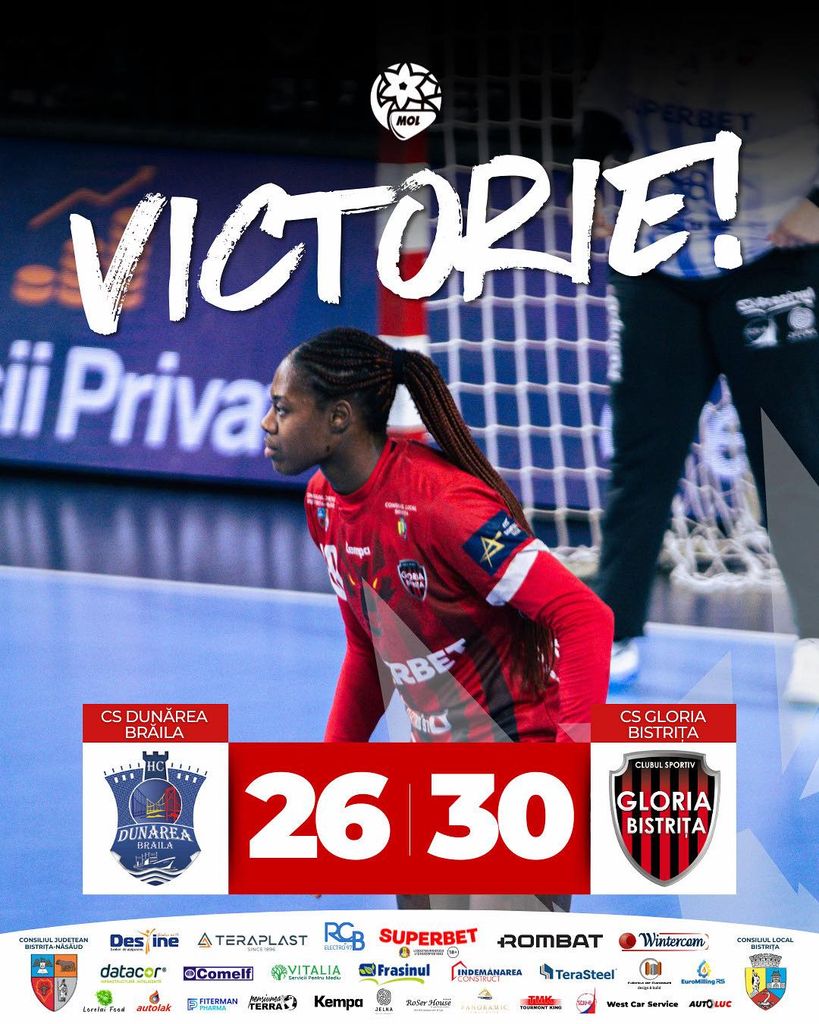 Echipa de handbal feminin Gloria Bistrița s-a impus în deplasare cu Dunărea Brăila, într-o partidă contând pentru etapa a 16-a din Liga Florilor, și a reușit a noua victorie la rând în campionat: 30-26 (15-11).