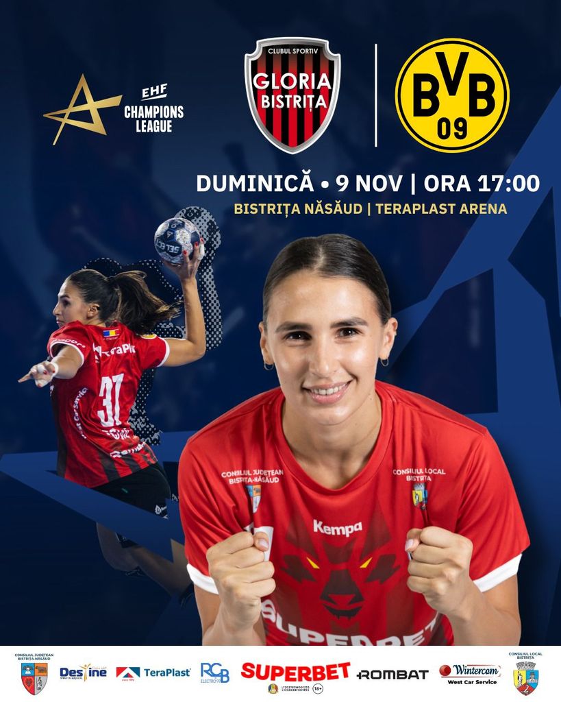 Aflată pe locul 3 în Grupa A din Liga Campionilor la handbal feminin, Gloria Bistrița joacă pe teren propriu în runda a 7-a cu Borussia Dortmund, echipa germană fiind penultima în clasament.