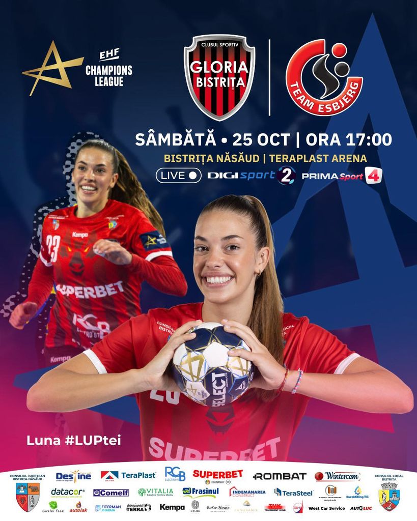 Gloria Bistrița va juca pe teren propriu în etapa a 5-a din Liga Campionilor la handbal feminin, Grupa A, cu Team Esbjerg din Danemarca. Cele două echipe sunt la egalitate de puncte, despărțite de golaveraj, pe locurile 5 respectiv 3.