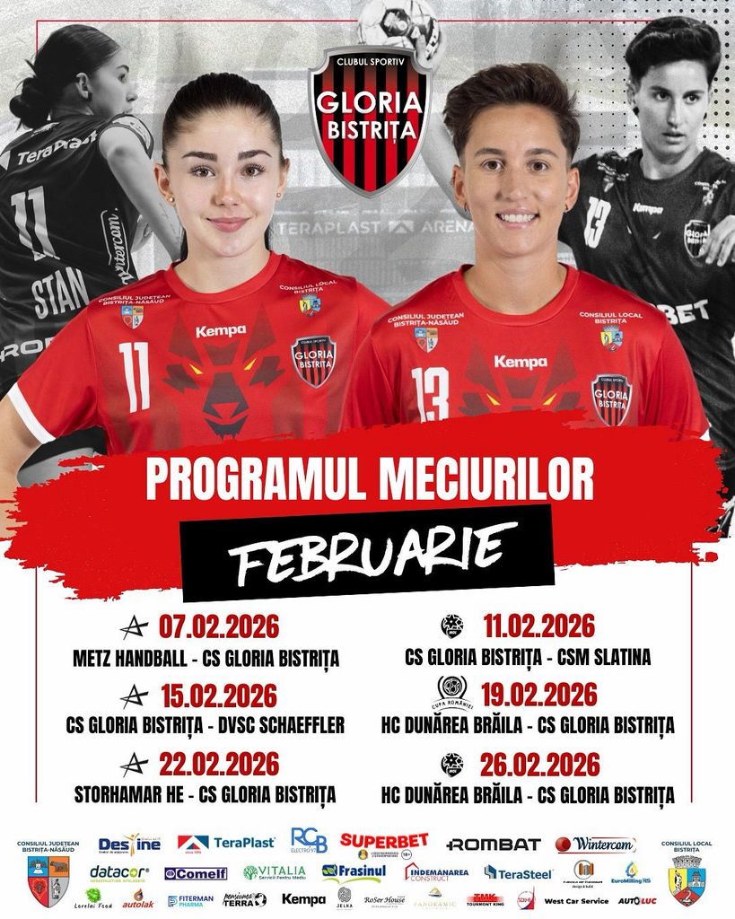 Echipa de handbal feminin Gloria Bistrița, lider provizoriu în Liga Florilor și deja calificată în play-off-ul (optimile) Ligii Campionilor, va disputa în luna februarie șase meciuri în toate competițiile.