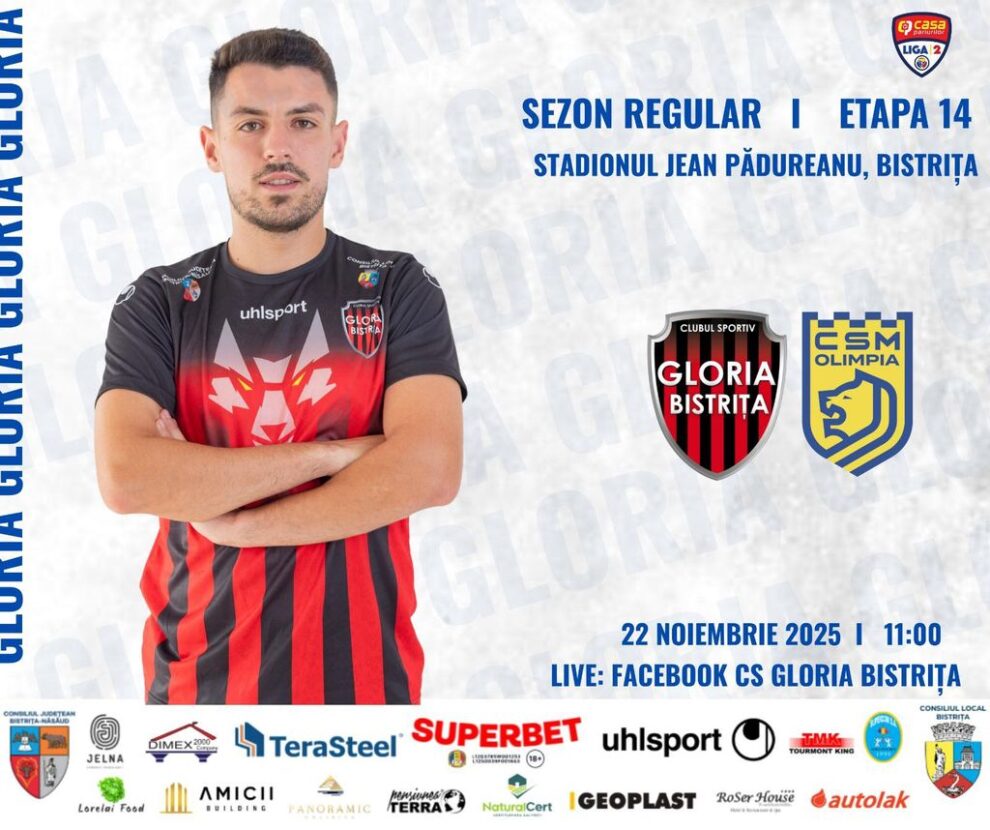 Gloria Bistrița, care ocupă locul 19 în Liga 2 la fotbal, joacă pe teren propriu în etapa a 14-a împotriva ultimei clasate, Olimpia Satu Mare.