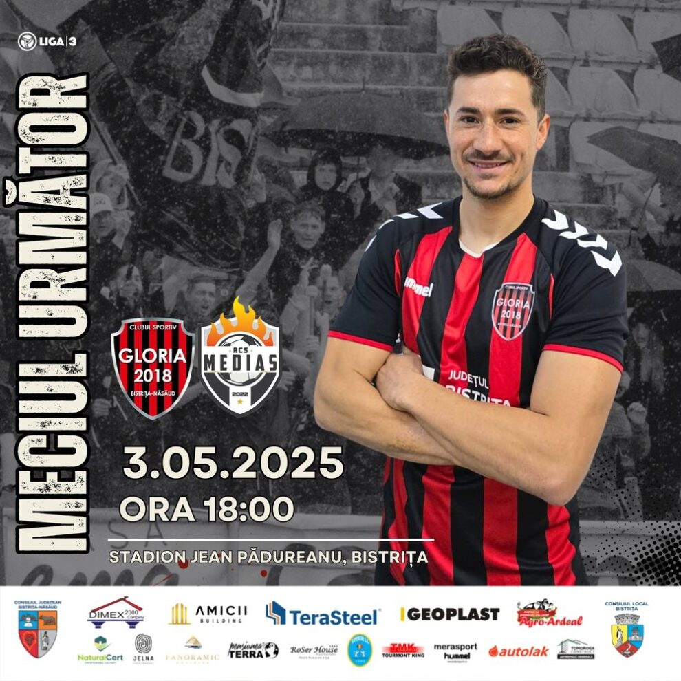 Meciul Gloria – ACS Mediaș este programat sâmbătă 3 mai, de la ora 18.00, pe Stadionul ”Jean Pădureanu” din Bistrița.