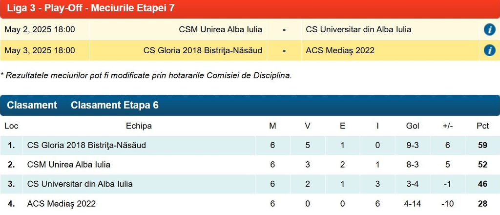 Fotbal: Gloria 2018 Bistrița-Năsăud, aflată pe primul loc în play-off-ul Seriei 7 din Liga 3 și calificată matematic pentru faza semifinală a barajului de promovare, joacă pe teren propriu în etapa a 7-a.
