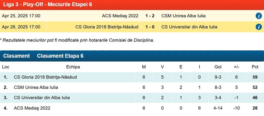 În etapa a 6-a din play-off, Gloria s-a impus pe Stadionul ”Jean Pădureanu” în fața CS Universitar din Alba Iulia, tot în stil italian, cu scorul de 1-0, după ce la pauză a fost 0-0. Golul victoriei a fost marcat de Stejărel Vișinar în minutul 67.