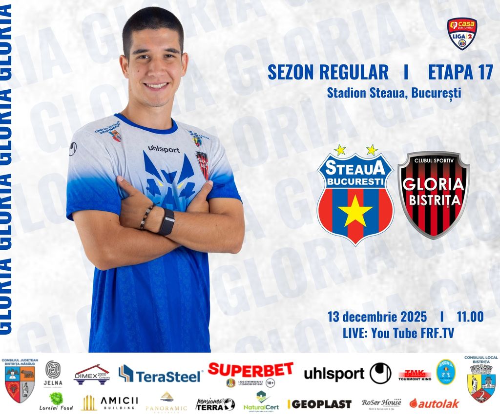 Gloria Bistrița, aflată pe locul 18 în Liga 2 la fotbal, va juca în deplasare ultimul meci din acest an, contând pentru runda a 17-a, cu CSA Steaua București (locul 5).