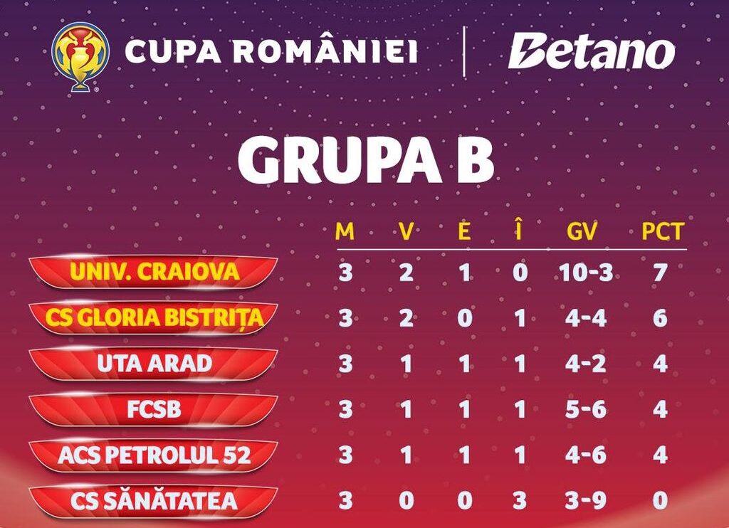 Gloria Bistrița a reușit surpriza Grupei B din Cupa României la fotbal. Învingând-o pe teren propriu pe UTA Arad, echipa antrenată de Nicolae Grigore s-a calificat de pe locul 2 în sferturile competiției, unde va juca împotriva câștigătoarei din Grupa A, FC Argeș.