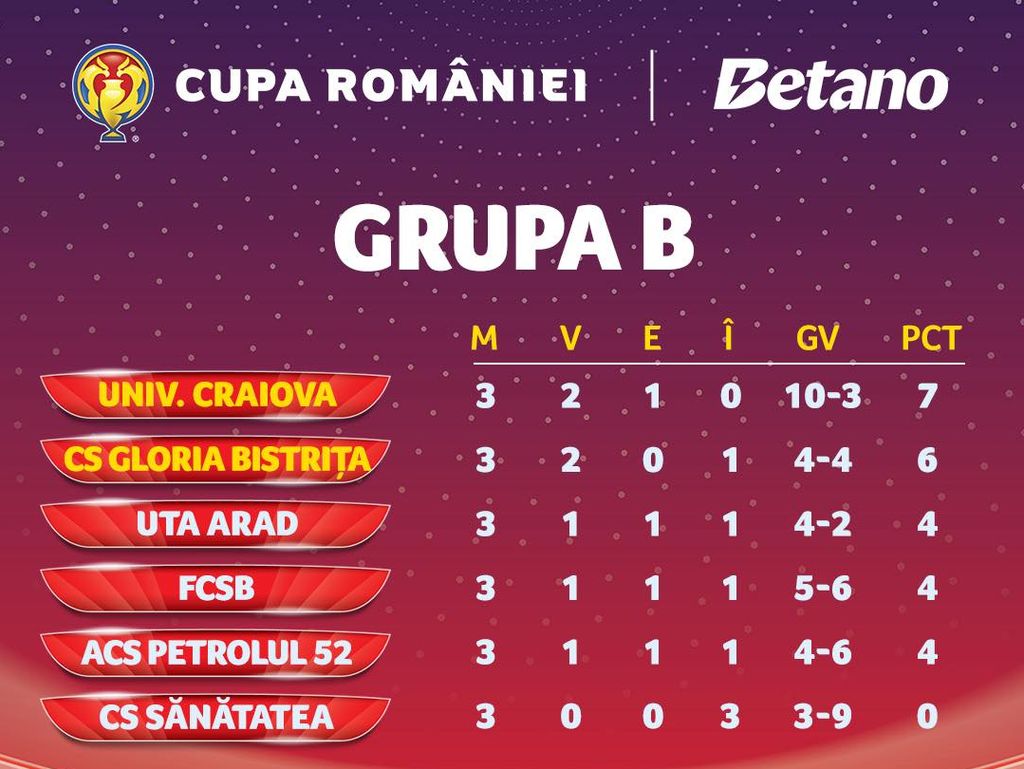Celelalte jocuri din etapa 3 a Grupei B: Sănătatea Cluj – Petrolul Ploiești 1-3, Universitatea Craiova – FCSB 2-2. Rezultatele din etapa 1: Gloria Bistrița – FCSB 1-3, Sănătatea Cluj – Universitatea Craiova 1-4, UTA Arad – Petrolul Ploiești 1-1. Rezultatele din etapa 2: Sănătatea Cluj – Gloria Bistrița 1-2, UTA Arad – FCSB 3-0, Petrolul Ploiești – Universitatea Craiova 0-4.