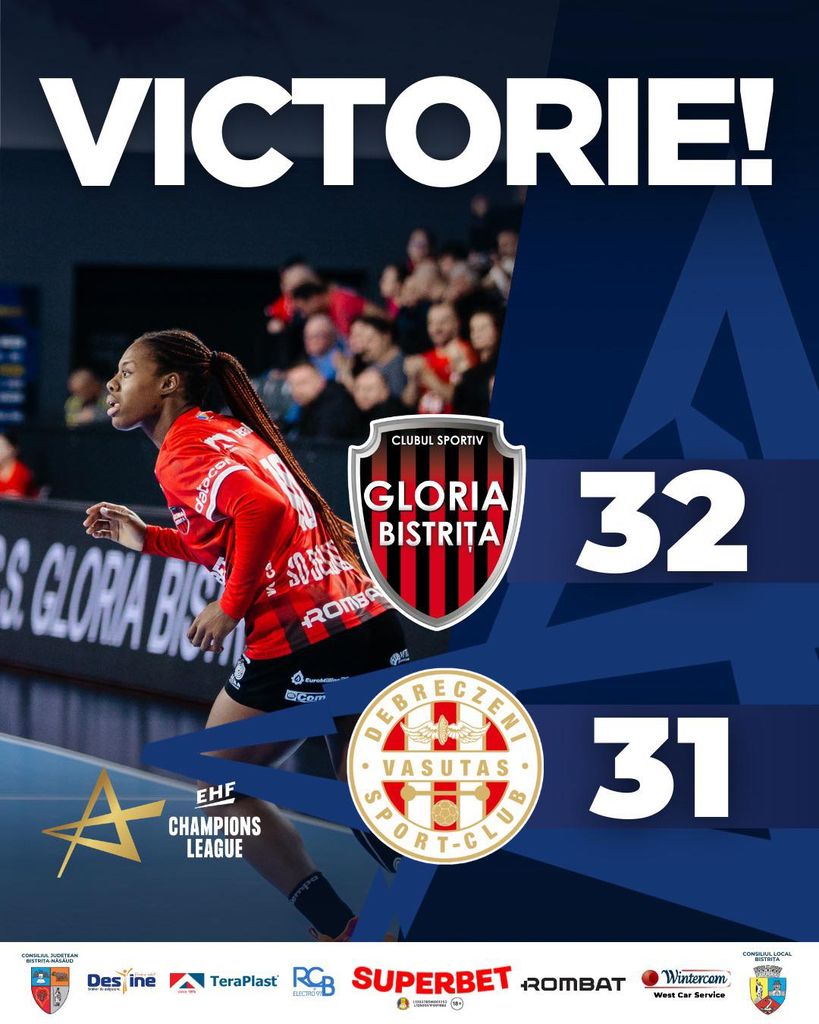 Echipa de handbal feminin Gloria Bistrița a câștigat meciul de pe teren propriu cu Debrecen VSC Schaeffler din Ungaria, în penultima rundă din Grupa A a Ligii Campionilor, și și-a asigurat matematic locul 4, urmând să întâlnească în play-off-ul pentru sferturi ocupanta locului 5 în Grupa B.