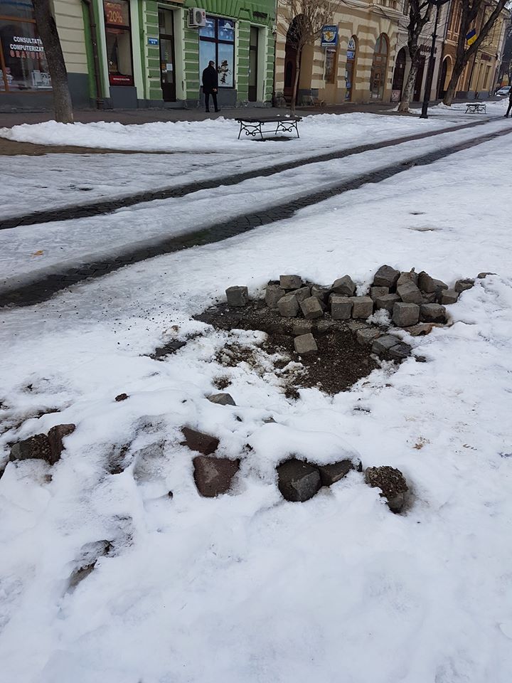 “Pietonalul Liviu Rebreanu, zona zero a oraşului arată ca un şantier uitat. Stâlpii folosiţi pentru iluminatul de sărbători au fost de mult luați, dar gropile şi pavajul rânjesc la trecători în aşteptarea victimelor. Alo, primăria, e cineva acasă??”, a scris Ioan Turc.