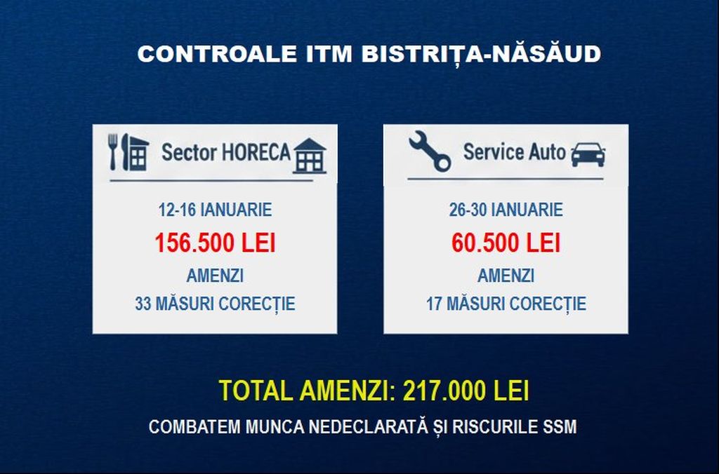 Inspectorii de muncă din cadrul ITM Bistrița-Năsăud au dat amenzi de 215.000 de lei în luna ianuarie a.c. în urma a două campanii pentru combaterea muncii nedeclarate și verificarea respectării normelor de securitate și sănătate în muncă.