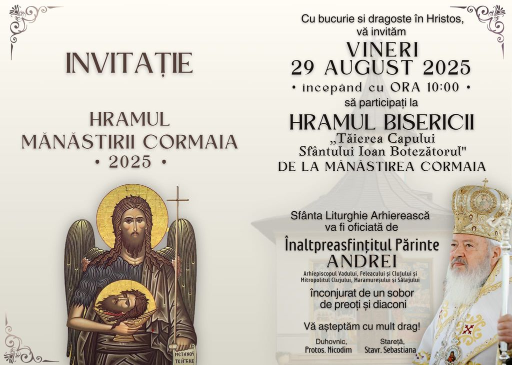 La sărbătoarea Tăierii Capului Sfântului Proroc Ioan Botezătorul, vineri 29 august, Mănăstirea Cormaia își serbează hramul.