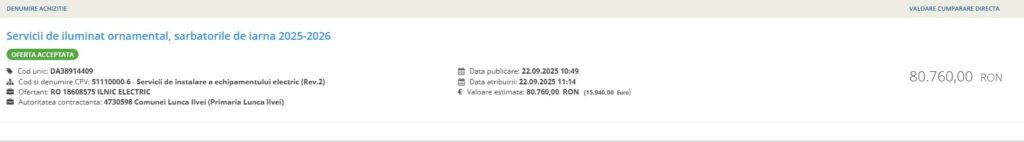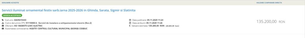 În data de 5 noiembrie, Centrul Cultural Municipal ”George Coșbuc” a acceptat oferta de 135.200 de lei (27.000 de euro) de la aceeași firmă pentru iluminatul festiv al cartierelor Ghinda, Sărata, Sigmir și Slătinița.