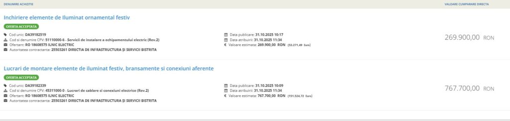 Direcția de Infrastructură și Servicii Bistrița a închiriat, în 31 octombrie a.c., de la firma Ilnic Electric SRL din Maramureș elemente de iluminat ornamental pentru sărbătorile de iarnă în valoare de peste 53.000 de euro. În aceeași zi a fost acceptată și oferta de peste 150.000 de euro pentru montarea lor.