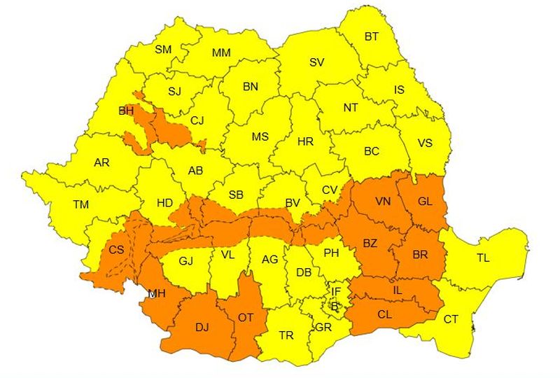 În cea mai mare parte a țării vântul va avea intensificări cu viteze de 50…70 km/h, iar la altitudini de peste 1.700 m rafalele vor fi de 75…85 km/h.