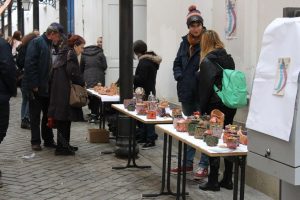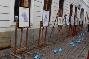 Bistriţenii care au trecut, vineri, prin zona centrală au putut vedea o mulţime de perechi de papuci vopsiţi în albastru care porneau din incinta Liceului de Arte “Corneliu Baba” şi erau direcţionaţi spre Pasajul artelor, semn că se întâmplă ceva. Cei mai curioşi s-au oprit să admire opere de artă expuse pe şevalet sau atârnate pe pasaj şi să cumpere ceramică sau tablouri de la elevi.