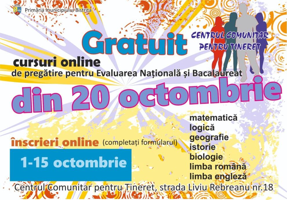 Până în 15 octombrie se pot face înscrieri la cursurile de pregătire pentru Evaluarea Națională și Bacalaureat, organizate la Centrul Comunitar pentru Tineret Bistrița, str. Liviu Rebreanu nr. 18.