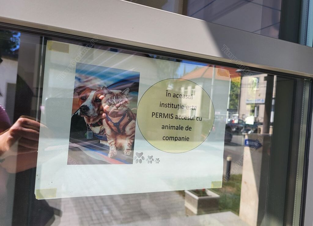 Este vorba despre Agenția Județeană pentru Ocuparea Forței de Muncă Bistrița-Năsăud unde, la intrare, veți găsi un afiș drăguț care vă va face să zâmbiți. Un cățel și un pisoi vă anunță că puteți intra împreună cu animalele voastre de companie.