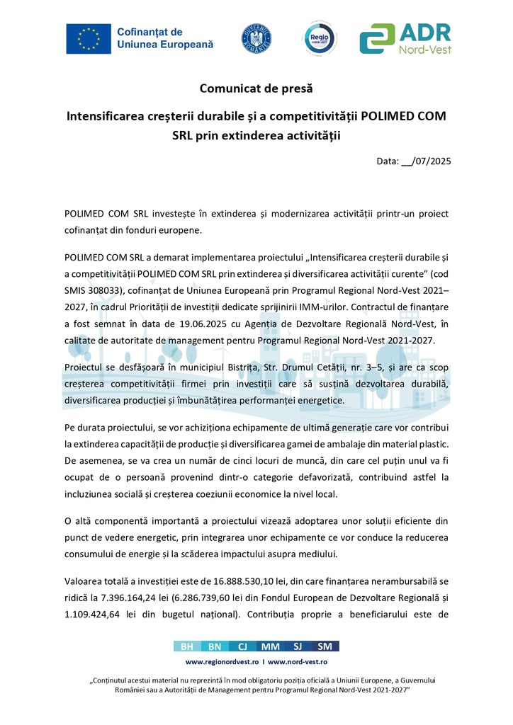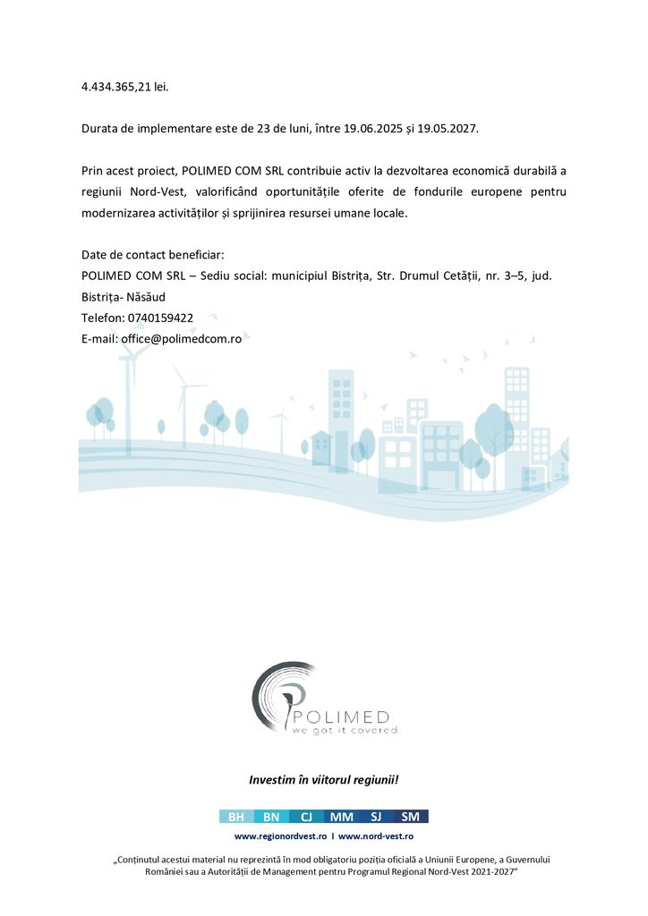 POLIMED COM SRL investește în extinderea și modernizarea activității printr-un proiect cofinanțat din fonduri europene.