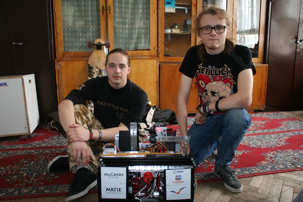 Nu în ultimul rând, elevii Dragoş Mureșan, cls. A XI-a, James-Florin Petri, cls. A XI-a, şi Dan-Alexandru Buzan, cls. A XI-a, prezintă robotul utilitar.