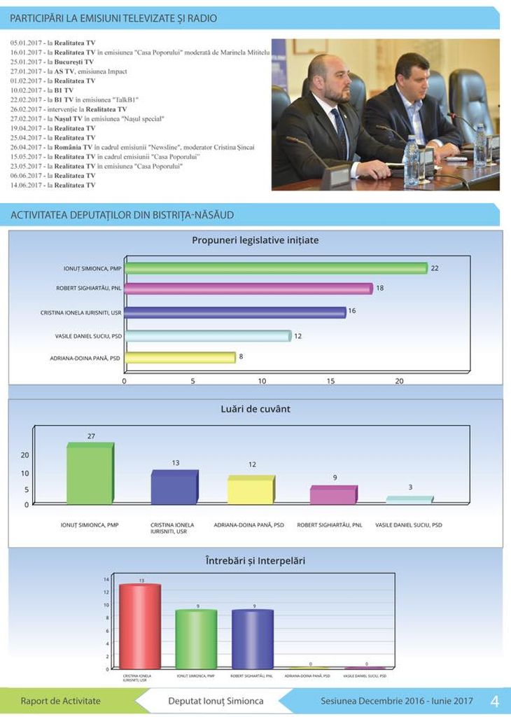 Deputatul Ionuț Simionca, președintele PMP Bistrița-Năsăud, prezintă ultima parte a raportului de activitate parlamentară din sesiunea decembrie 2016 – iunie 2017: graficele comparative cu “Activitatea deputaților din Bistrița-Năsăud”.