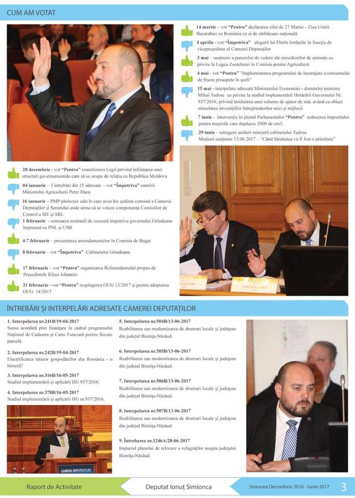 Deputatul Ionuț Simionca, președintele PMP Bistrița-Năsăud, continuă prezentarea raportului de activitate parlamentară din sesiunea decembrie 2016 – iunie 2017 cu a treia parte: “Cum am votat” și “Întrebări și interpelări adresate”.