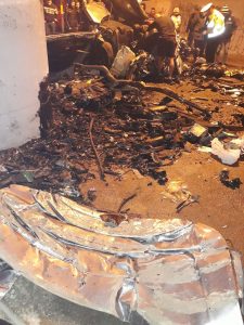 Aşa cum se poate vedea din imagini, impactul cu stâlpul a fost atât de puternic încât maşina s-a ridicat cu partea din spate în sus şi aşa a şi rămas, ca şi cum ar fi fost înfiptă de cineva în asfalt.