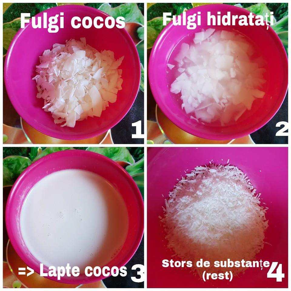- 30-50 gr. fulgi lați de cocos (1) . Nu recomandăm a cumpăra nuca gata mărunțită sau praful de nucă pentru că aceasta poate fi deja procesată și lipsită (secătuită) de nutrienți.