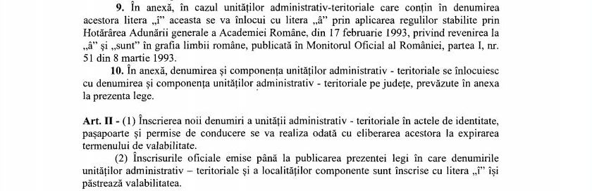 Legea prevede că ”în cazul unităților administrativ-teritoriale care conțin în denumirea acestora litera ”î”, aceasta se va înlocui cu litera ”â”, prin aplicarea regulilor stabilite prin Hotărârea Adunării Generale a Academiei Române, din 17 februarie 1993, privind revenirea la ”â” și ”sunt” în grafia limbii române”.