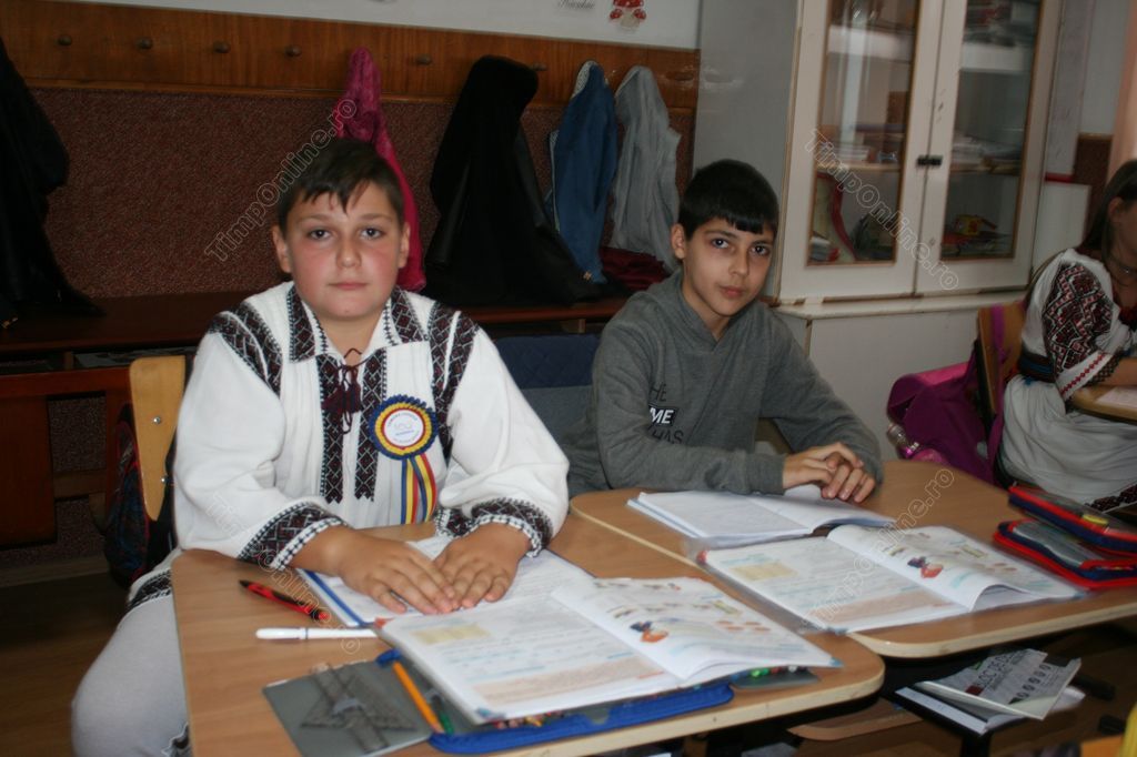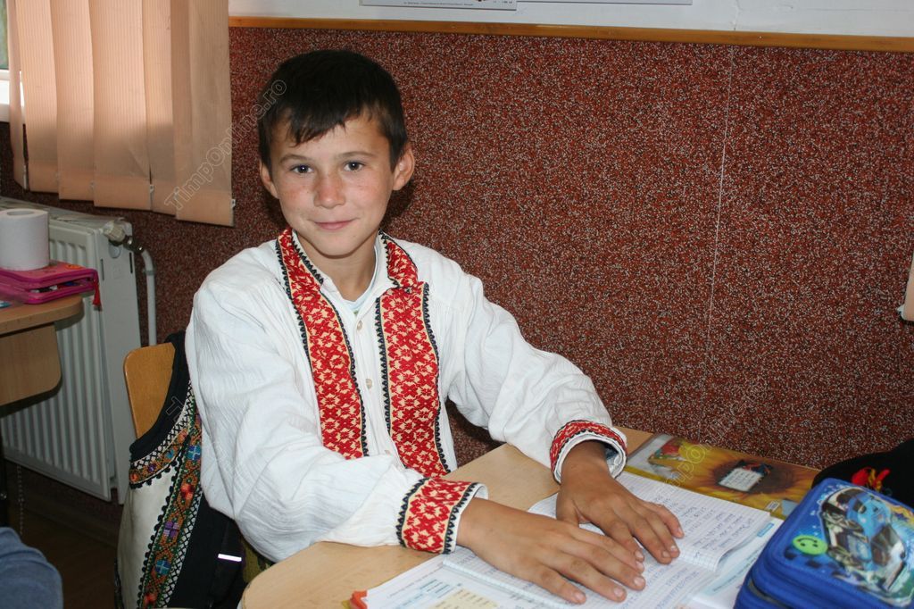 Denis Ştefănuţ (foto stânga) face un efort şi mai mare să vină îmbrăcat în straie populare. Copilul face naveta cu microbuzul de la o distanţă destul de mare. Cu toate acestea, poartă un costum vechi, inclusiv pieptar fiindcă vrea cu adevărat să meargă în excursie în oraşul Unirii, el nemaifiind plecat până acum de acasă. La fel îşi doreşte şi colegul lui Robert (foto dreapta).