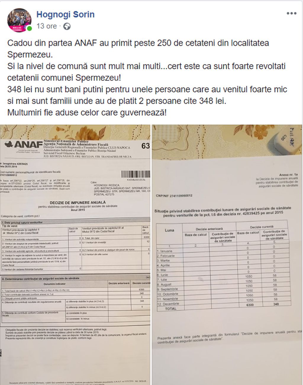 Unele familii au aflat, cu această ocazie, că au de plătit statului câteva sute de lei pentru că ar fi primt bani trimiși din străinătate de rudele lor, scrie pe Facebook primarul comunei Spermezeu, Sorin Hognogi.