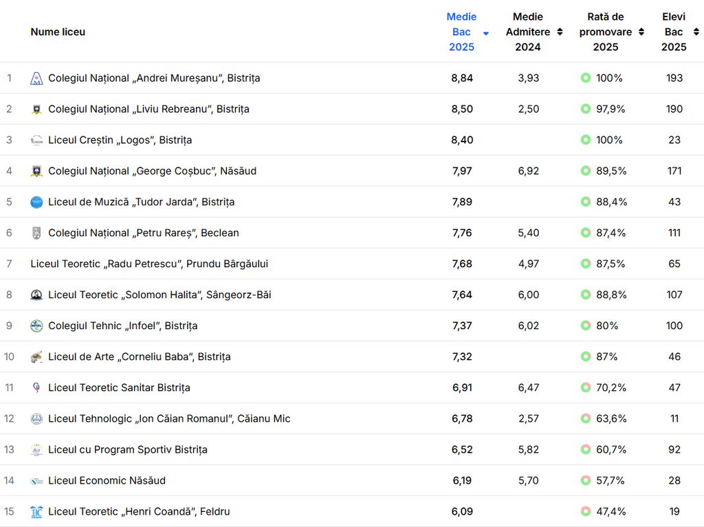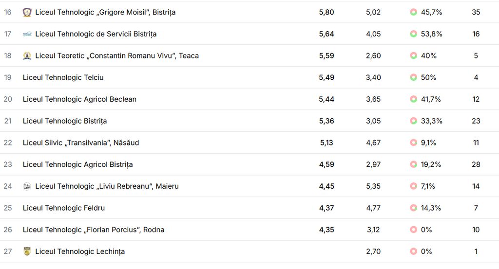 Potrivit bacplus.ro, dintre cele 27 de licee din Bistrița-Năsăud, două – Liceul Tehnologic ”Florian Porcius” Rodna și Liceul Tehnologic Lechința – au avut promovabilitate zero la examenul de Bacalaureat din acest an. Liceul Tehnologic ”Liviu Rebreanu” Maieru a avut 7%, iar Liceul Silvic ”Transilvania” Năsăud – 9,1%.