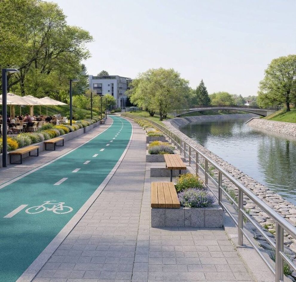 Doar porțiunea între Podul Jelnei și Podul Budacului este parte a proiectului Linia Albastră. Pentru celălalt mal, se lucrează la un masterplan care va include zona din spatele cimitirului de la Unirea până la Podul Berarăriei din Bistrița.