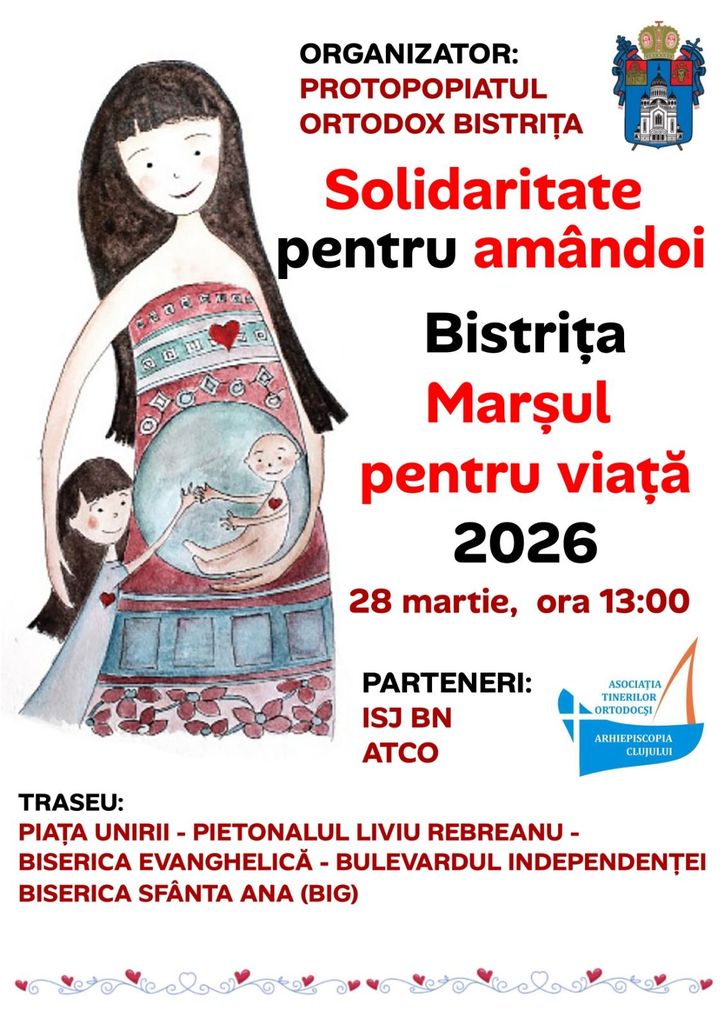 Protopopiatul Ortodox Bistrița organizează sâmbătă 28 martie ediția 2026 a Marșului pentru Viață, cel mai mare eveniment pro-viață din întreaga lume, care promovează și susține viața chiar din momentul concepției. Tema din acest an este ”Solidaritate pentru amândoi”.