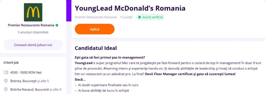 Între timp, pe site-uri de recrutare, McDonald’s anunță că este dispusă să recruteze tineri și din Bistrița care să facă primii pași spre o carieră în management în restaurante. Programul YoungLead oferă participanților o experiență completă de formare: sesiuni de training, mentorat și experiență directă în coordonarea echipelor din restaurante. Tinerii pot învăța cum să conducă o echipă, cum să ia decizii și să se dezvolte profesional într-un mediu real de business.