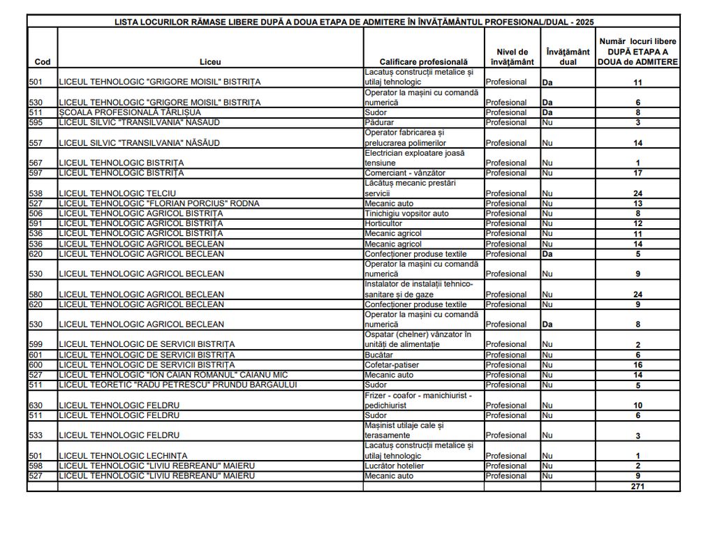 Peste 270 de locuri au rămas libere în școlile profesionale din județ după a doua etapă de admitere, iar 38 în sistem dual unde, pe lângă bursa profesională, elevii mai primesc bani și din partea agenților economici unde fac practică.