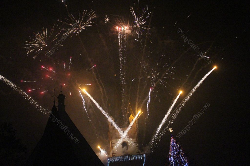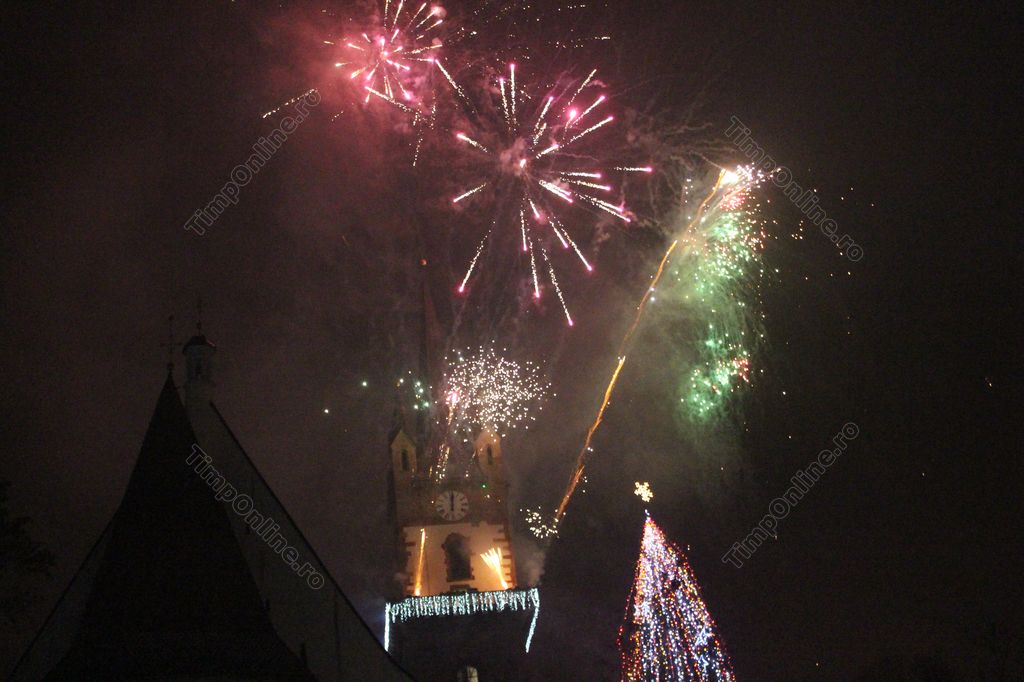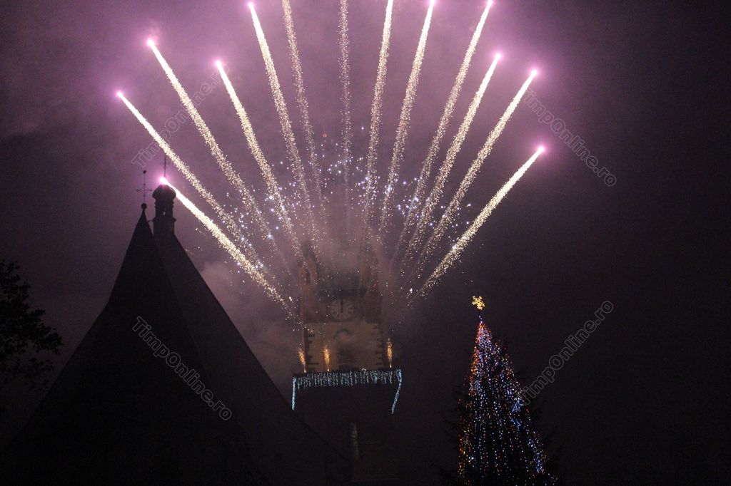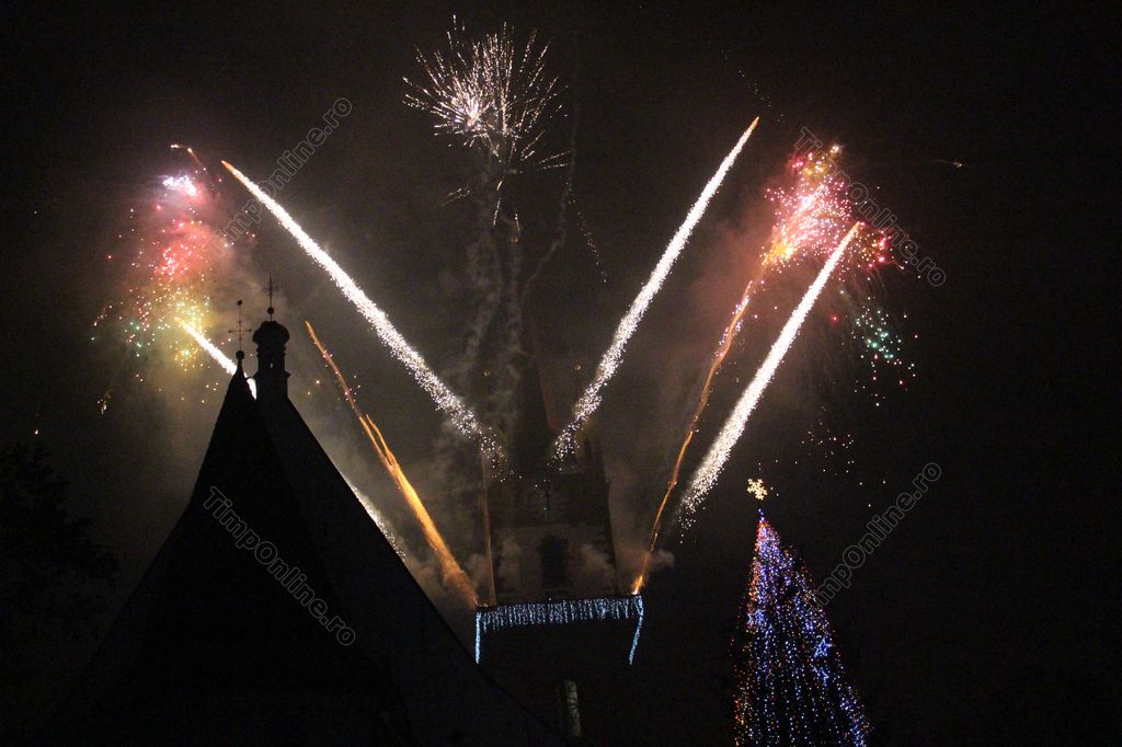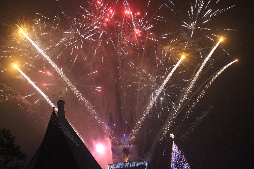 (FOTO-VIDEO) Intrarea în Noul An 2018 a fost marcată în centrul istoric al Bistriței printr-un impresionant foc de artificii, având ca punct principal al feeriei de lumină și culoare turnul Bisericii Evanghelice.