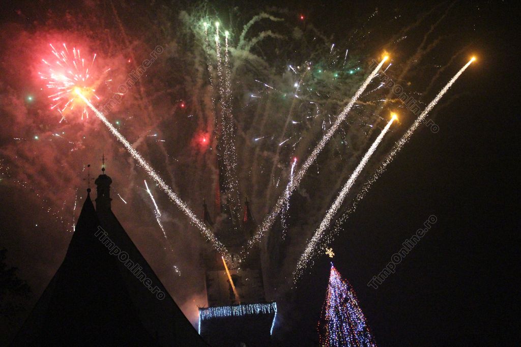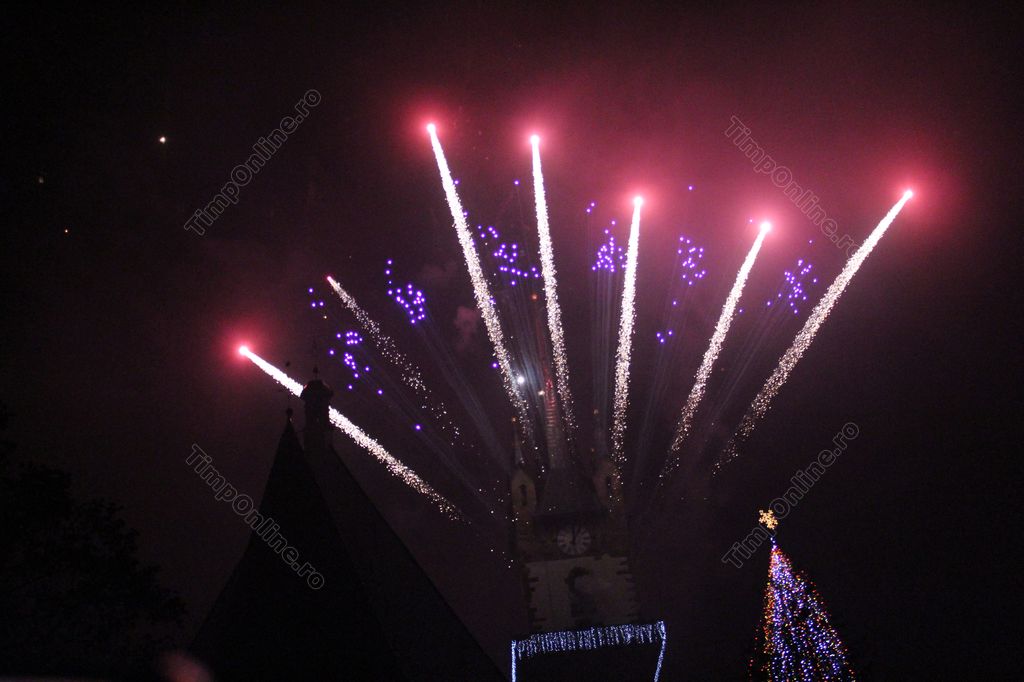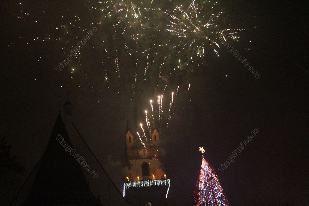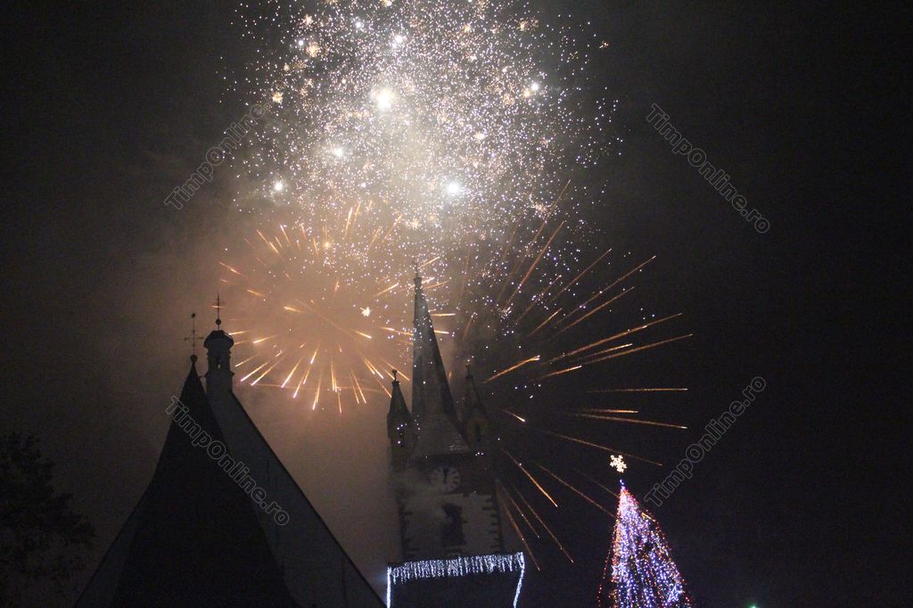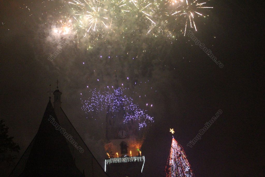 (FOTO-VIDEO) Intrarea în Noul An 2018 a fost marcată în centrul istoric al Bistriței printr-un impresionant foc de artificii, având ca punct principal al feeriei de lumină și culoare turnul Bisericii Evanghelice.