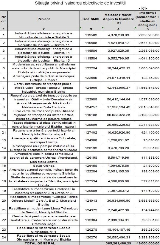 ”În anul 2019, la nivelul municipiului Bistrița se află în derulare diverse proiecte importante de investiții, finanțate cu fonduri europene, în valoare de 365 milioane lei dintre care amintim următoarele: reconfigurare axa de transport public, linie verde de transport public, centru intermodal de transport public, amenajare piste de cicliști, reabilitare și modernizare școli publice, îmbunătățirea eficienței energetice a blocurilor de locuințe, etc. Pentru toate aceste obiective de investiții există documentație tehnico-economică aprobată, iar pentru unele există contracte de finanțare semnate și se află în faza de contractare a lucrărilor. Realizarea acestora presupune însă existența unor importante resurse financiare, resurse care nu se regăsesc în totalitate în bugetul local al municipiului Bistrița. O soluție alternativă utilizată de către autorităţile publice pentru atragerea rapidă a capitalului necesar realizării obiectivelor de investiţii de interes local este contractarea unui împrumut care să fie avantajos din punct de vedere economic (costurile creditului, dobânda şi comisioanele să fie cât mai mici). În acestă situaţie propunem aprobarea contractării unei finanțări rambursabile interne prin credit bancar de tip linie de finanțare revolving în valoare de maxim 49 milioane lei, cu o maturitate de maxim 20 ani, din care 3 ani perioadă de grație, credit care pentru a fi cât mai avantajos din punctul de vedere al costurilor va fi obținut prin licitație publică.
