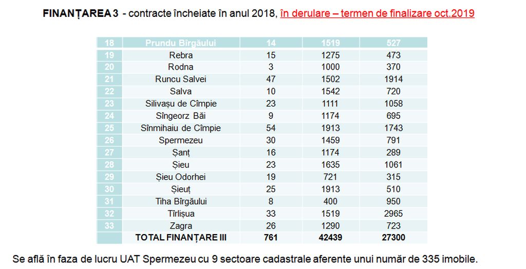 Au mai depus sectoare cadastrale în vederea recepționării și deschiderii noilor cărți funciare UAT-urile: Mărișelu (2 cu 121 imobile în lucru), Runcu Salvei (1 cu 105 imobile în perioada de afișare), Șieu (5 cu 822 imobile în perioada de afișare, pentru alte 300 de imobile fiind deschise cărțile funciare), Șieuț (2 cu 137 imobile finalizate), Zagra (5 cu 42 imobile în lucru)