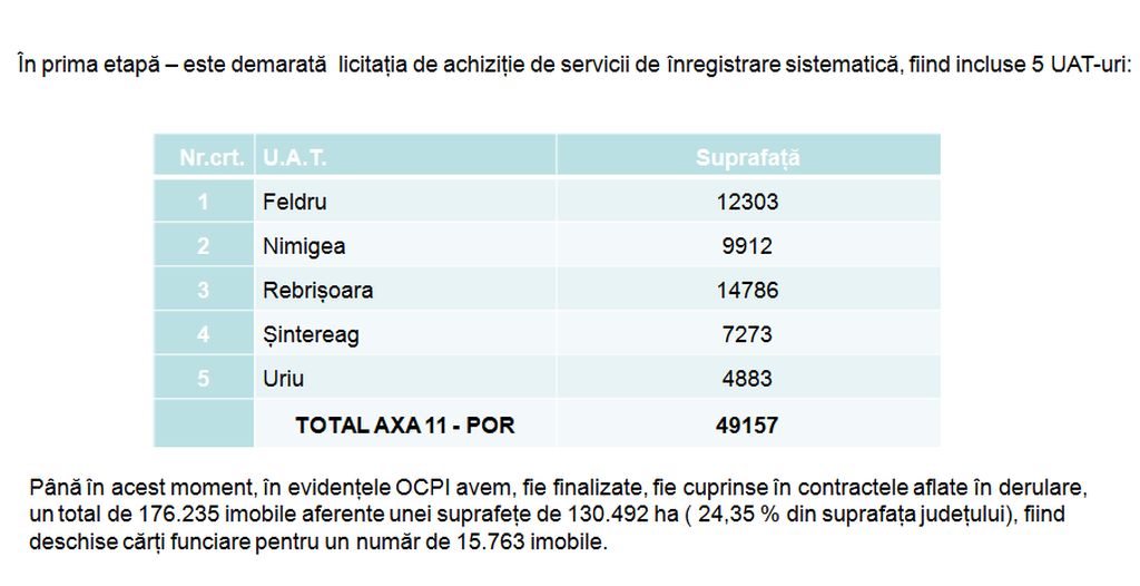Şeful OCPI Bistriţa-Năsăud, Emil Mănăşturean, a spus, la o şedinţă de Colegiu prefectural, că acţiunea de cadastrare a început în 2013 şi se face atât cu banii autorităţilor locale, cât şi ai ONCPI sau europeni.
