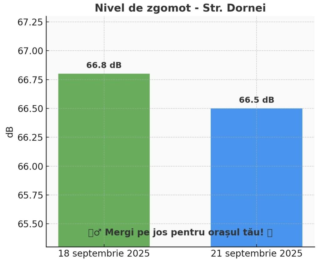 ”Astfel, s-a constatat că se înregistrează o scădere de 0,3 dB (≈0,45%) a nivelului de zgomot în weekend, odată cu reducerea circulației. Conform STAS 10009-88, limita admisă pentru străzile de categoria II este de 70 dB, astfel că valorile înregistrate se află sub pragul normativ. Weekendul aduce trafic mai redus, astfel că nivelul de zgomot scade cu 0,45%. O mică diferență, dar un pas spre un oraș mai liniștit și mai sănătos”, a transmis instituția pe Facebook.