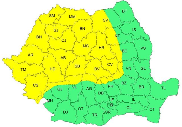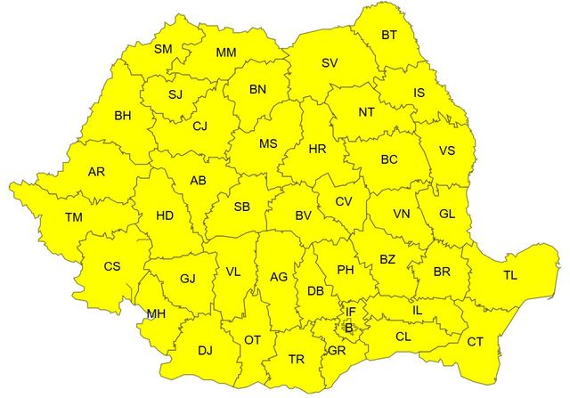 Luni 12 ianuarie, ora 20.00 – Marți 13 ianuarie, ora 10.00: Cod galben de temperaturi deosebit de scăzute, ger în cea mai mare parte a țării