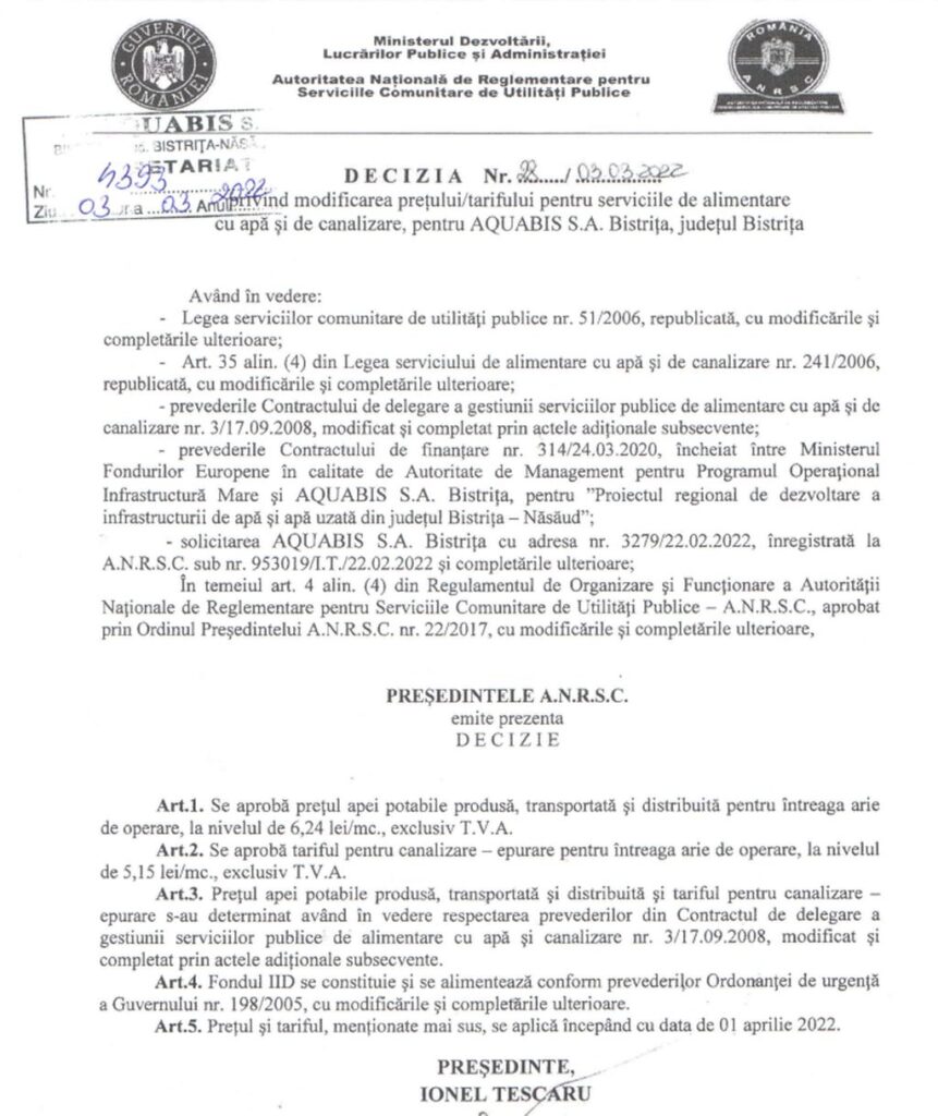 Noile tarife la apă și canalizare intră în vigoare din 1 aprilie 2022, urmare a deciziei Autorității Naționale de Reglementare pentru Serviciile Comunitare de Utilități Publice, transmisă Aquabis.