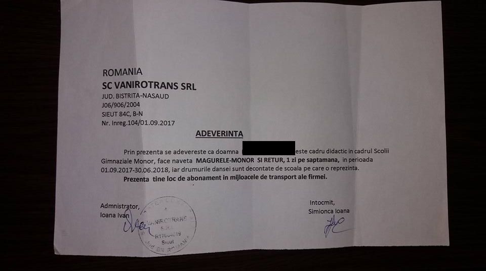 Zis şi făcut. A oprit autobuzul şi a dat-o jos. Întrebat dacă este singura pentru care nu se plăteşte naveta, patronul Vanirotrans a spus: “Da, da, numai pentru dânsa nu se plăteşte. Că e în alt regim pentru că doamna respectivă cu toţi şoferii mei se sustrage de la plată. Până de vreo două-trei luni o plătit fiecare profesor în parte. Li s-a eliberat abonament şi li s-a decontat. Acum, din 2018, cu schimbarea legii achiziţiei, plăteşte Primăria Monor. De acum, din 2018, nu o mai plătit pentru dânsa şi şoferul şi firma are dreptul să selecteze clienţii dacă nu plătesc. Din ianuarie nu a plătit Primăria Monor pentru această profesoară. Eu vă pot prezenta facturile şi decontul, iar doamna nu există pe facturi şi pe decontul respectiv. Şi dânsa nu a plătit. E o zi pe săptămână şi putea să-i dea banii pe bilet la şofer, dar e o zi pe săptămână şi s-a sustras. La adeverinţa respectivă, li se eliberează tichet-abonament, cartonaş. E un călător care se sustrage de la plată, dumneavoastră ce aţi face?”.