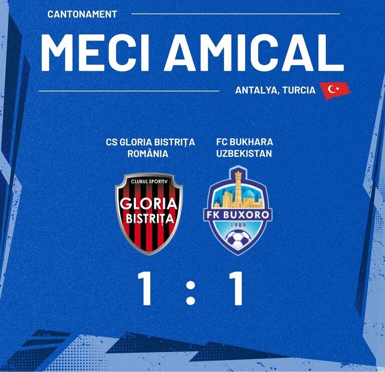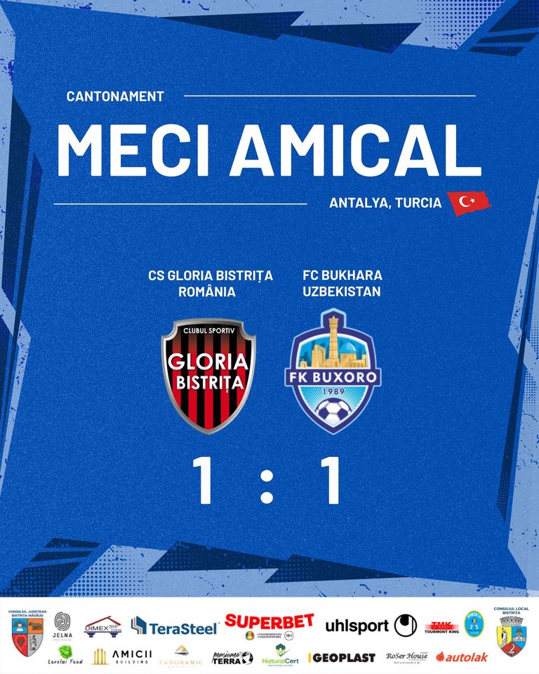 În al doilea meci de pregătire, Gloria a remizat cu FC Bukhara din Uzbekistan, scor 1-1. Golul echipei bistrițene a fost înscris de Emmanuel Mensah în minutul 86.