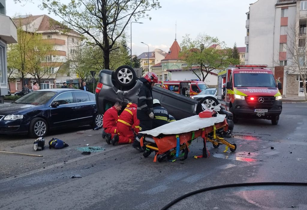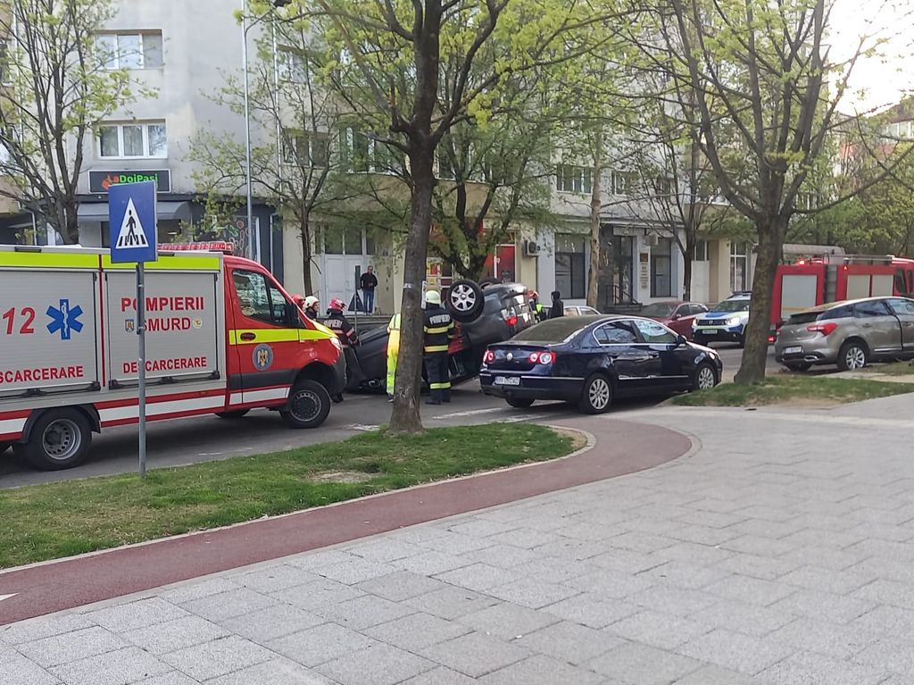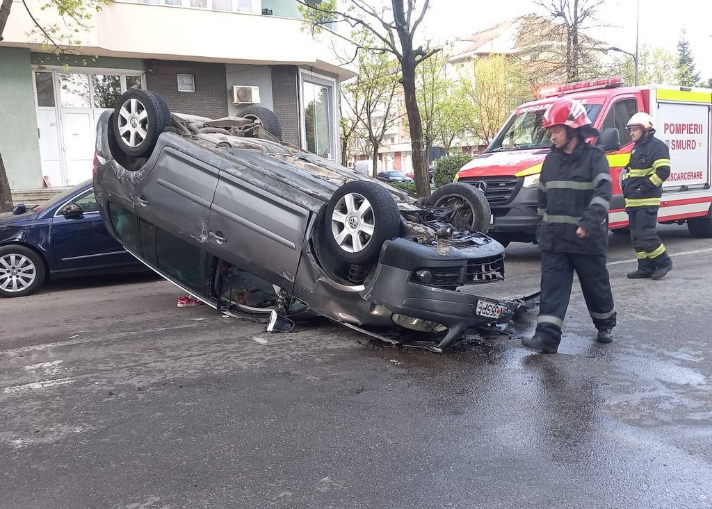 O mașină s-a răsturnat cu roțile în sus în urma unui accident petrecut vineri dimineața în jurul orei 06.50 pe bd. General Grigore Bălan din Bistrița.