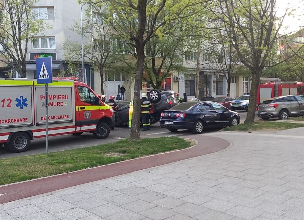 O mașină care a evitat un pieton s-a răsturnat și a intrat în alte două parcate