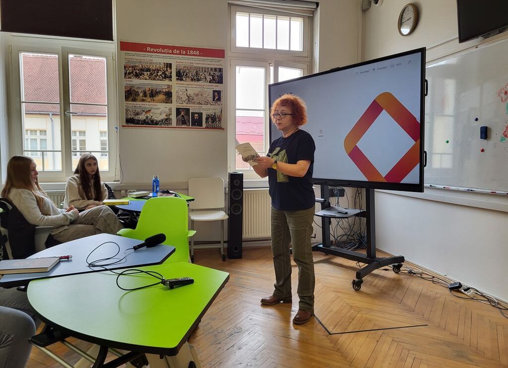 Directorul Colegiului Național ”Andrei Mureșanu”, prof. Monica Buboly, a ales să le citească unor elevi din clasa a IX-a C un fragment din cartea ”Cămașa în carouri” de Doina Ruști.