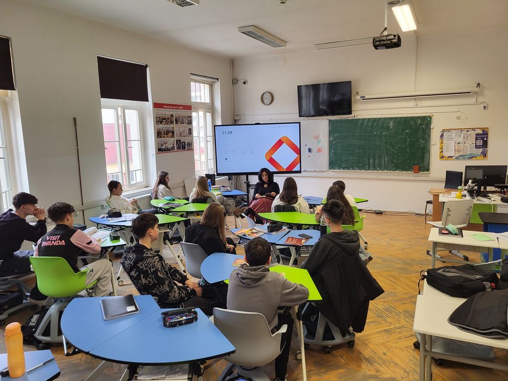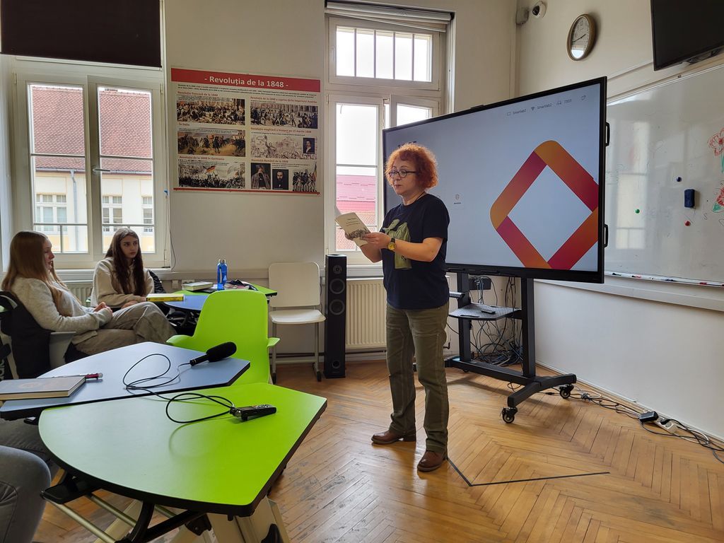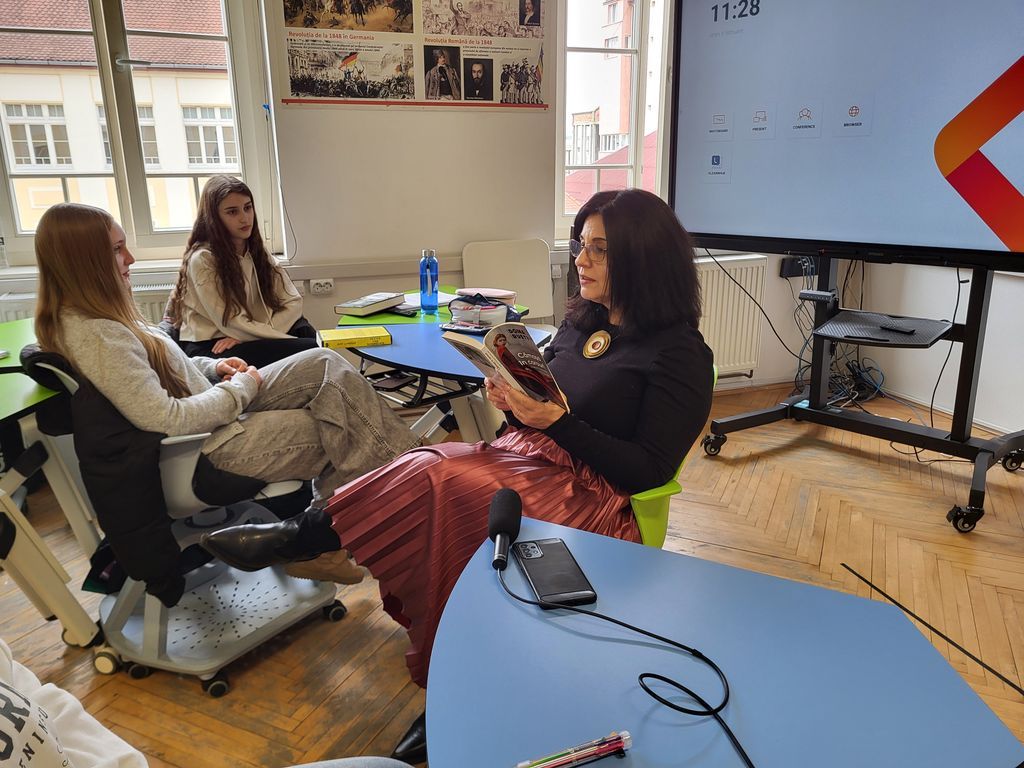 Directorul Colegiului Național ”Andrei Mureșanu”, prof. Monica Buboly, a ales să le citească unor elevi din clasa a IX-a C un fragment din cartea ”Cămașa în carouri” de Doina Ruști.