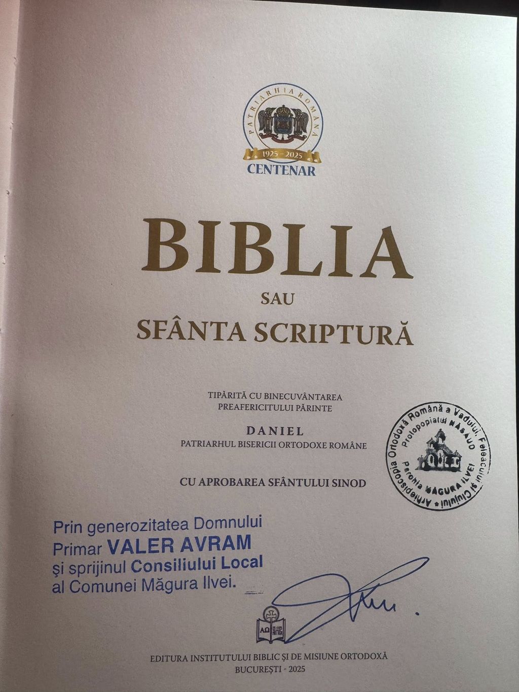 ”Părintele Stelian Tofană a vorbit despre ideea O Biblie pentru fiecare familie într-o conferință. La un moment dat, cu părintele, la biserică, am discutat că o să iau legătura cu Consiliul Local și noi ne vom asuma acest proiect. Am vrut să le oferim de Paștele trecut, dar tipărirea a durat. E o Biblie cu scris mai mare, cu trimiteri, și a ajuns doar în luna noiembrie 2025 și atunci, cu ocazia sfințirii caselor, când preoții au mers cu crucea, am distribuit în fiecare familie câte o Biblie din partea Primăriei și a Consiliului Local. Am tipărit 550 de bucăți, format A5, poate un pic mai mare, pentru că am vrut să fie scrisul ușor de citit de persoanele în vârstă”, a spus primarul din Măgura Ilvei, Valer Avram.